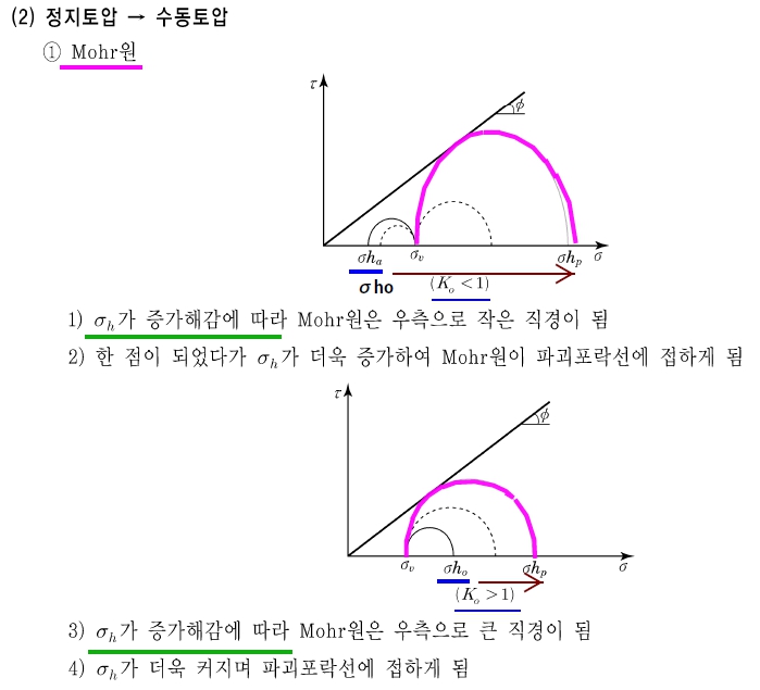1.위의 그림 첫째는 정지토압계수 Ko<1인경우, 두번째는 Ko>1인경우의 모아원변화임.